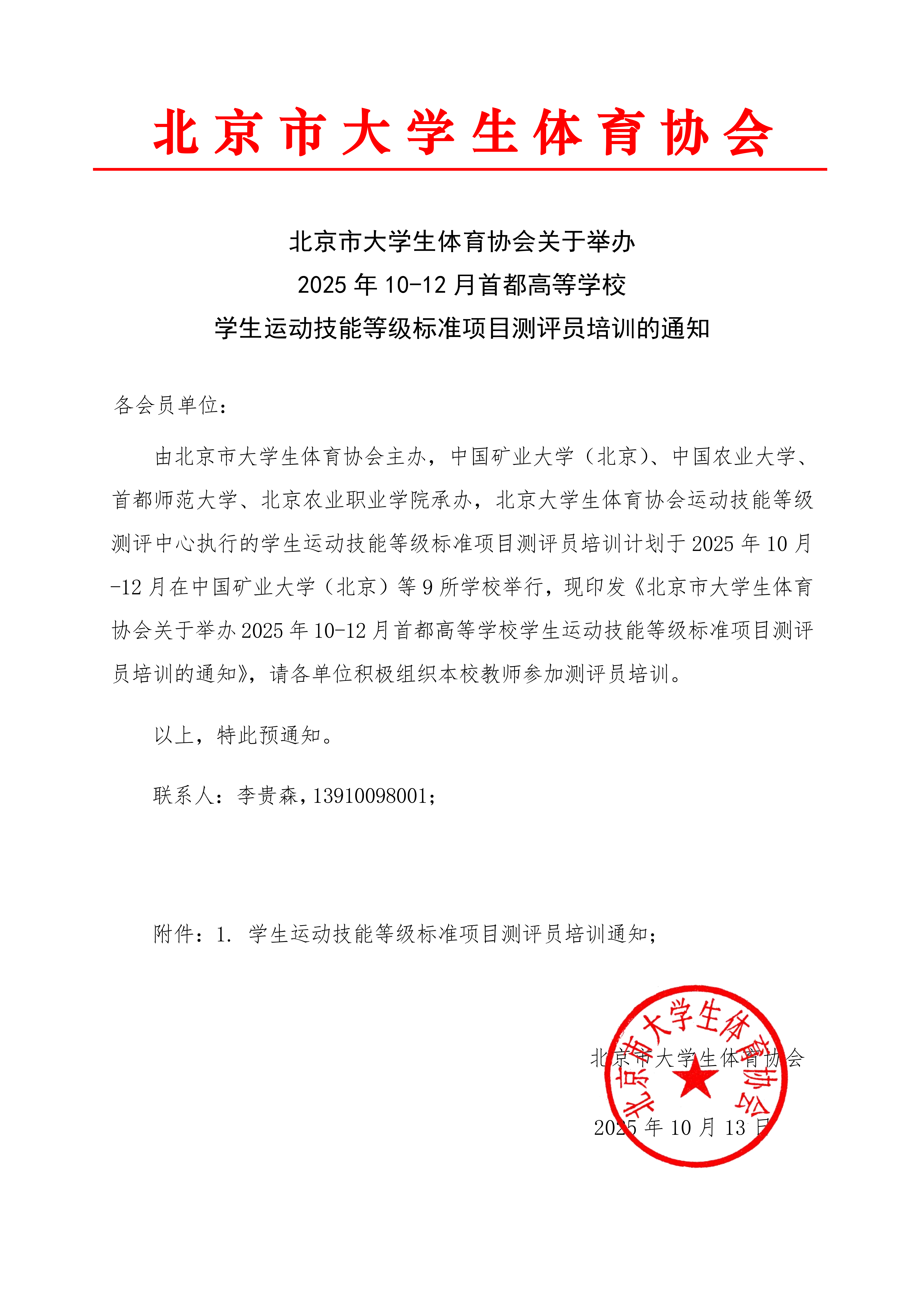 北京市大学生体育协会关于举办2025年10-12月首都高等学校学生运动技能等级标准项目测评员培训的通知