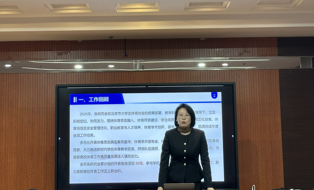教学群体科研部秘书刘杨汇报了九个分部过去一年主要的工作成绩、经验以及未来工作计划。2025年,教学群体科研部九个分部围绕“强化体育教学、丰富课余体育活动、加强体育教师队伍建设”核心目标,共开展研讨会19次,培训10次,举行教师基本功、演讲、运动技能选拔赛10次,举行校际交流以及特色活动21次。各分部立足自身优势,形成了“以赛促教、以研促改、以协同促发展”的良好发展态势,以实际行动助力首都高校体育事业高质量发展。